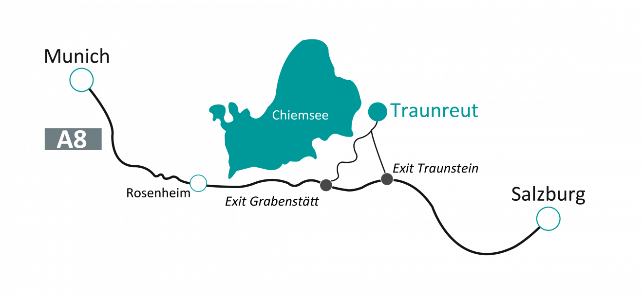 You will find us only 10 km east of Lake Chiemsee in the beautiful Chiemgau area, in southern Bavaria. Quick to reach via the A8 Munich - Salzburg.